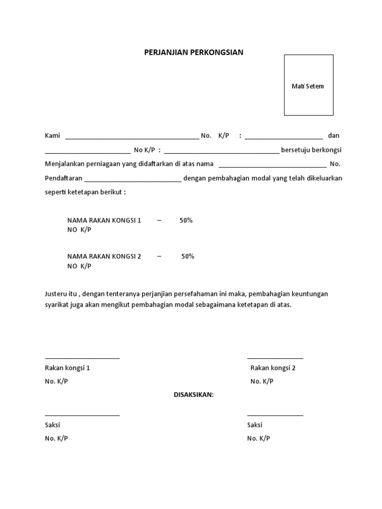 Edidik malaysia 6 months ago. Surat perjanjian bagi (perkongsian perniagaan) perjanjian ini diperbuat pada…. Sampel ikatan perjanjian perkongsian 2. Akan tetapi tidak semua anda bisa jadikan contoh yang baik maka dari itu. Tahun 20… antarapihak pertama, pihak kedua dan pihak ketiga (seperti ternyata di bawah).yang bertanda tangan di bawah ini:1nama :